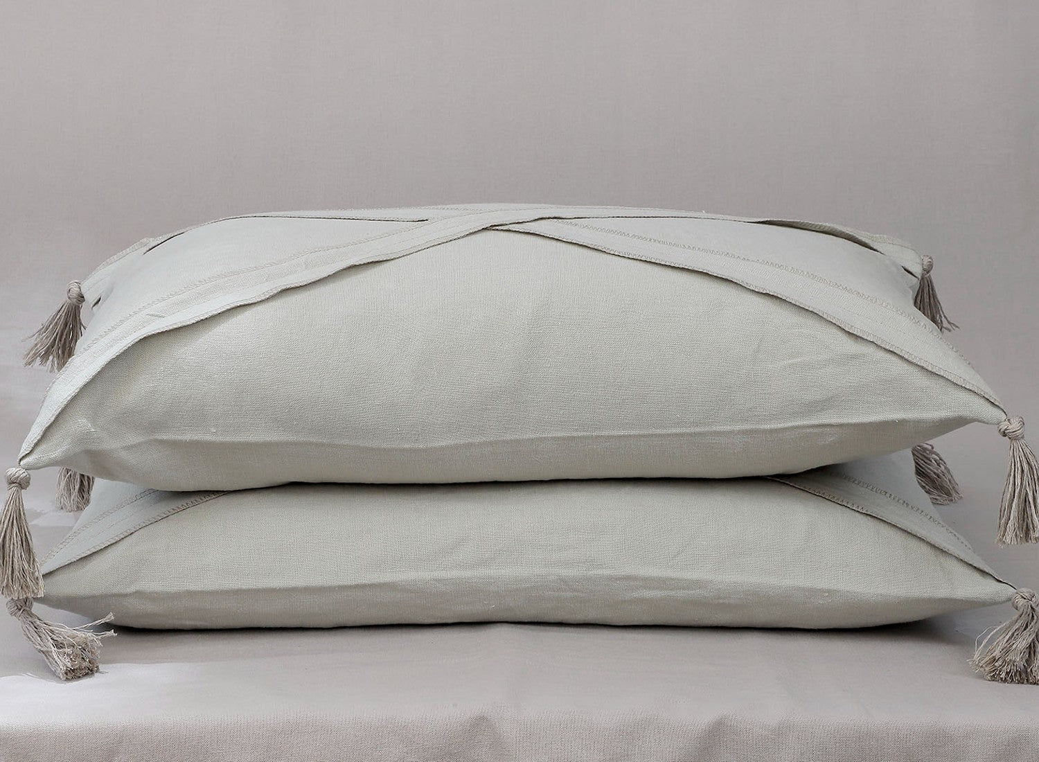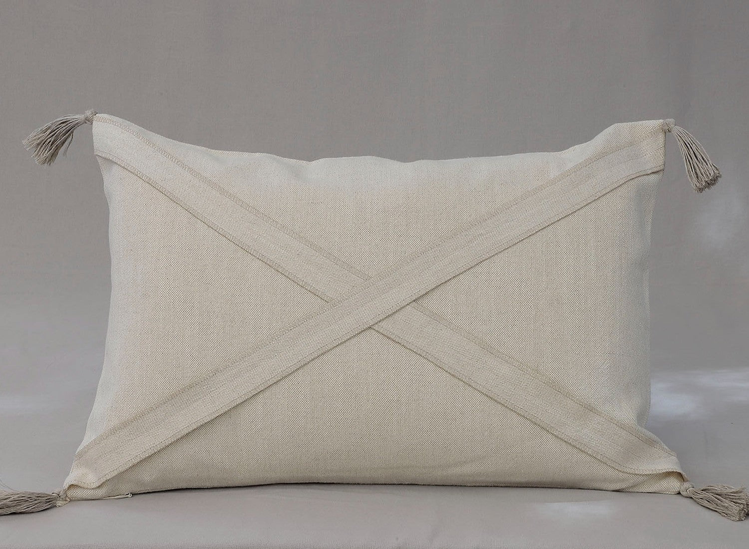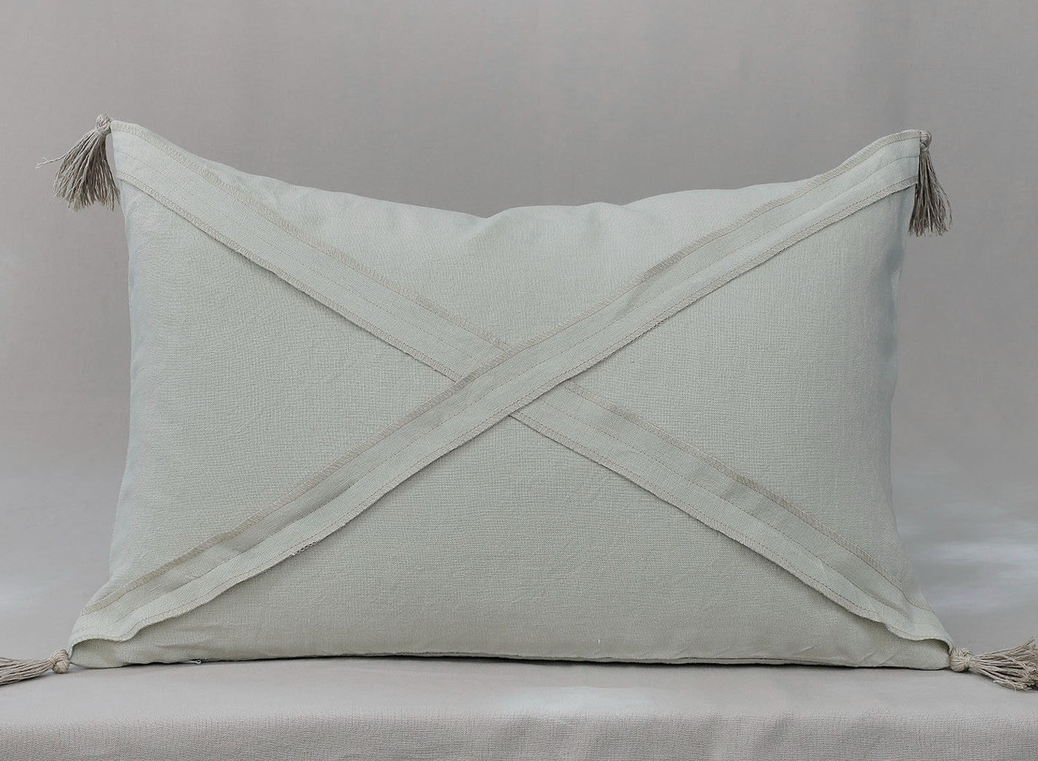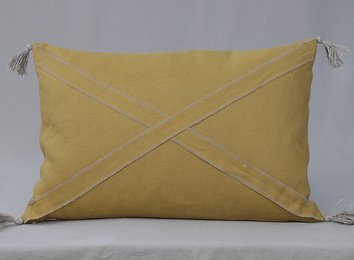 Cojín cruceta 100% lino con pompones relleno de plumas.