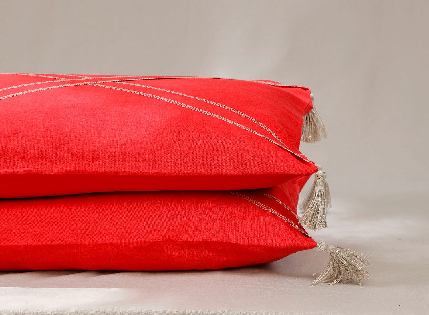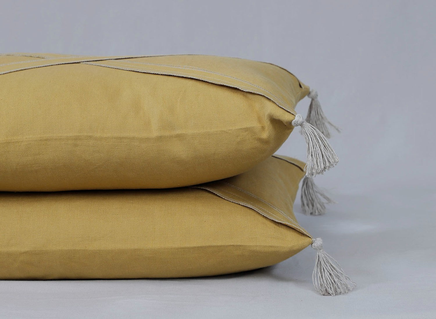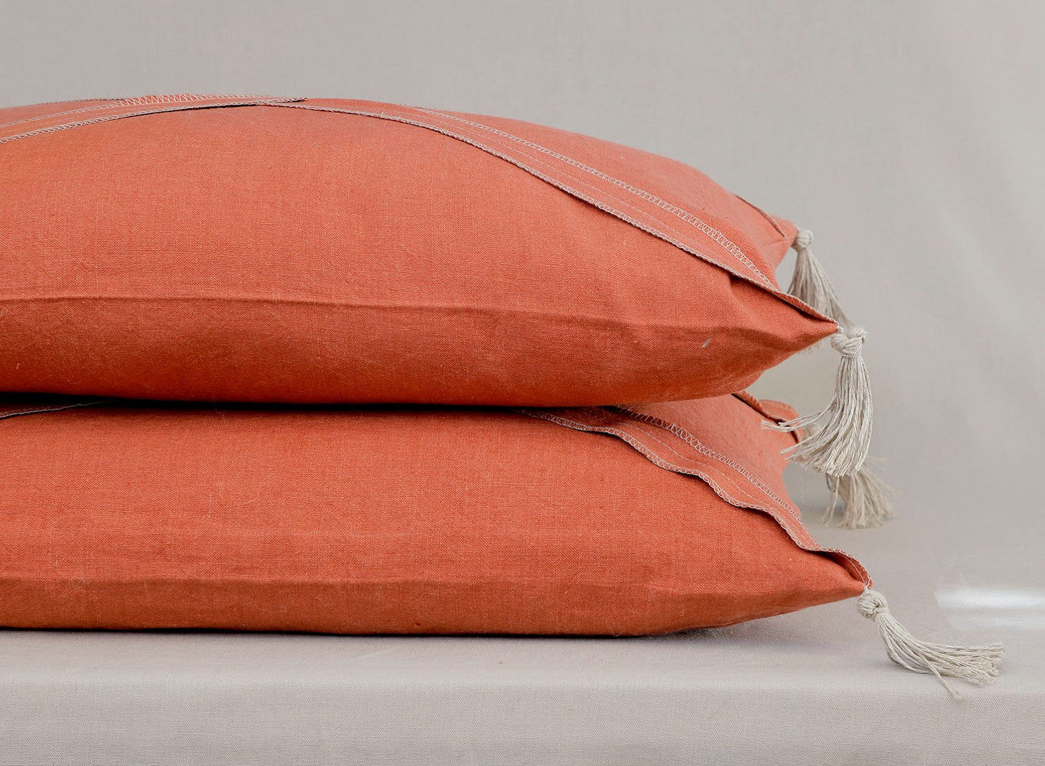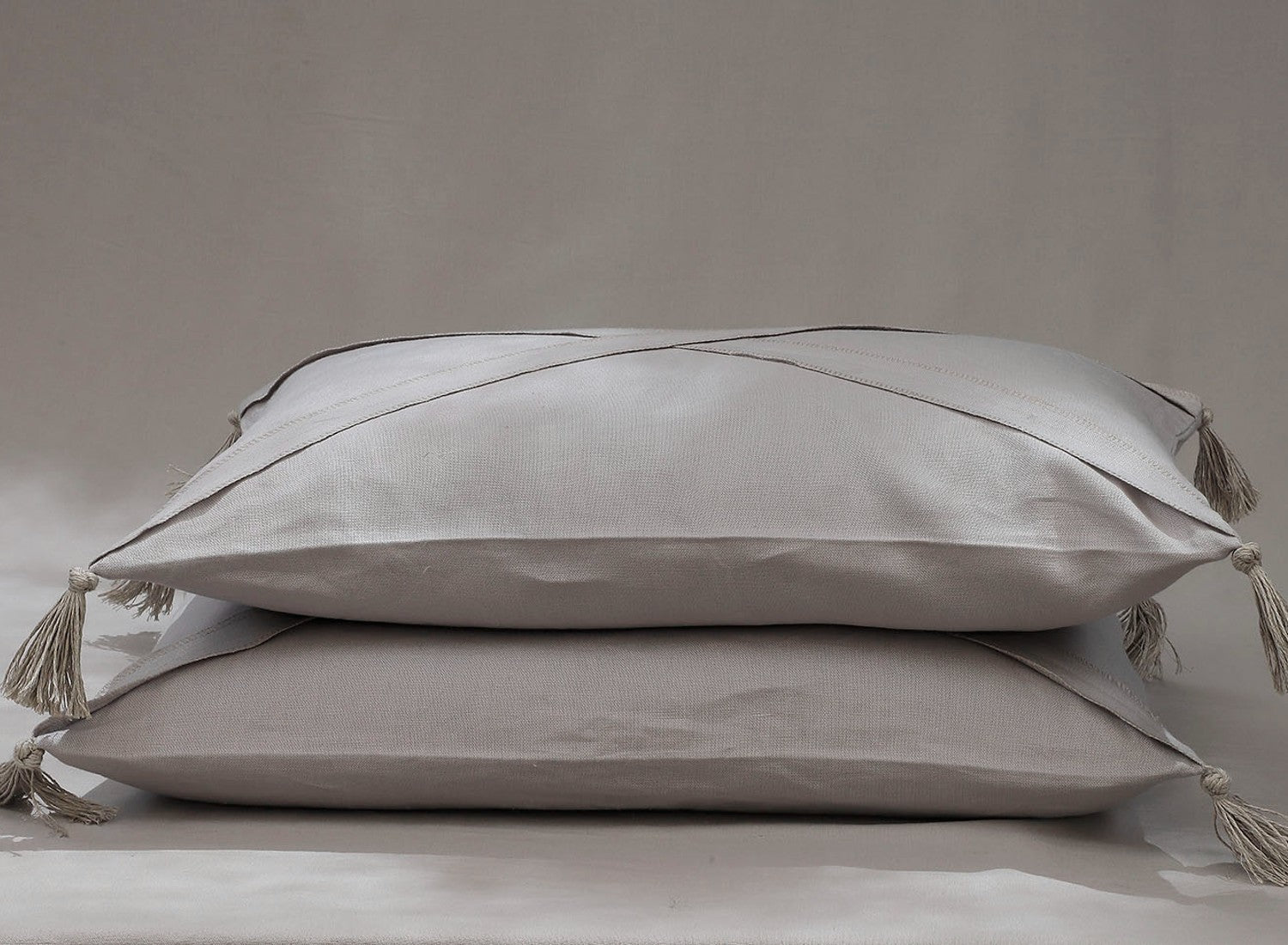 Cojín cruceta 100% lino con pompones relleno de plumas.